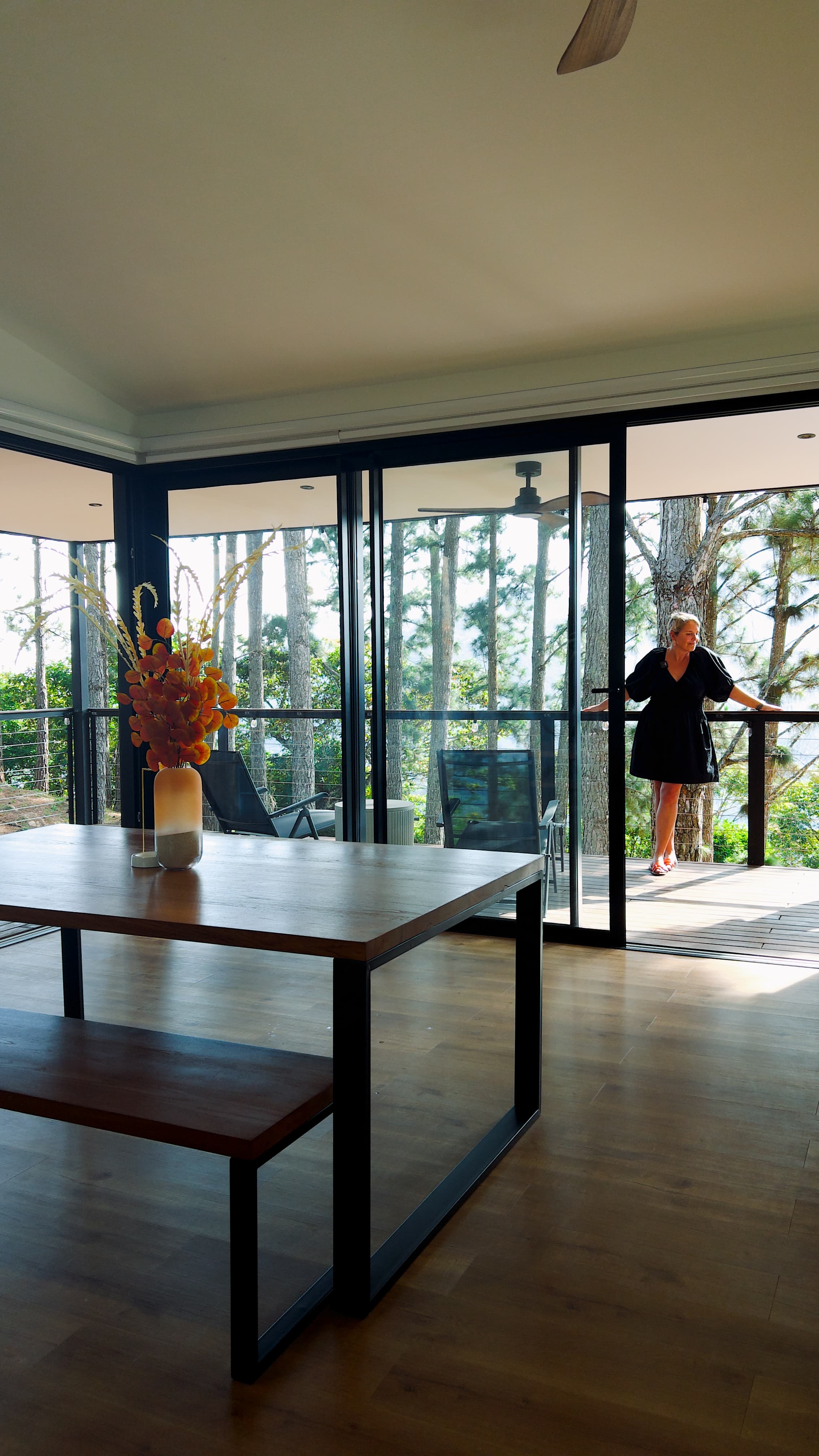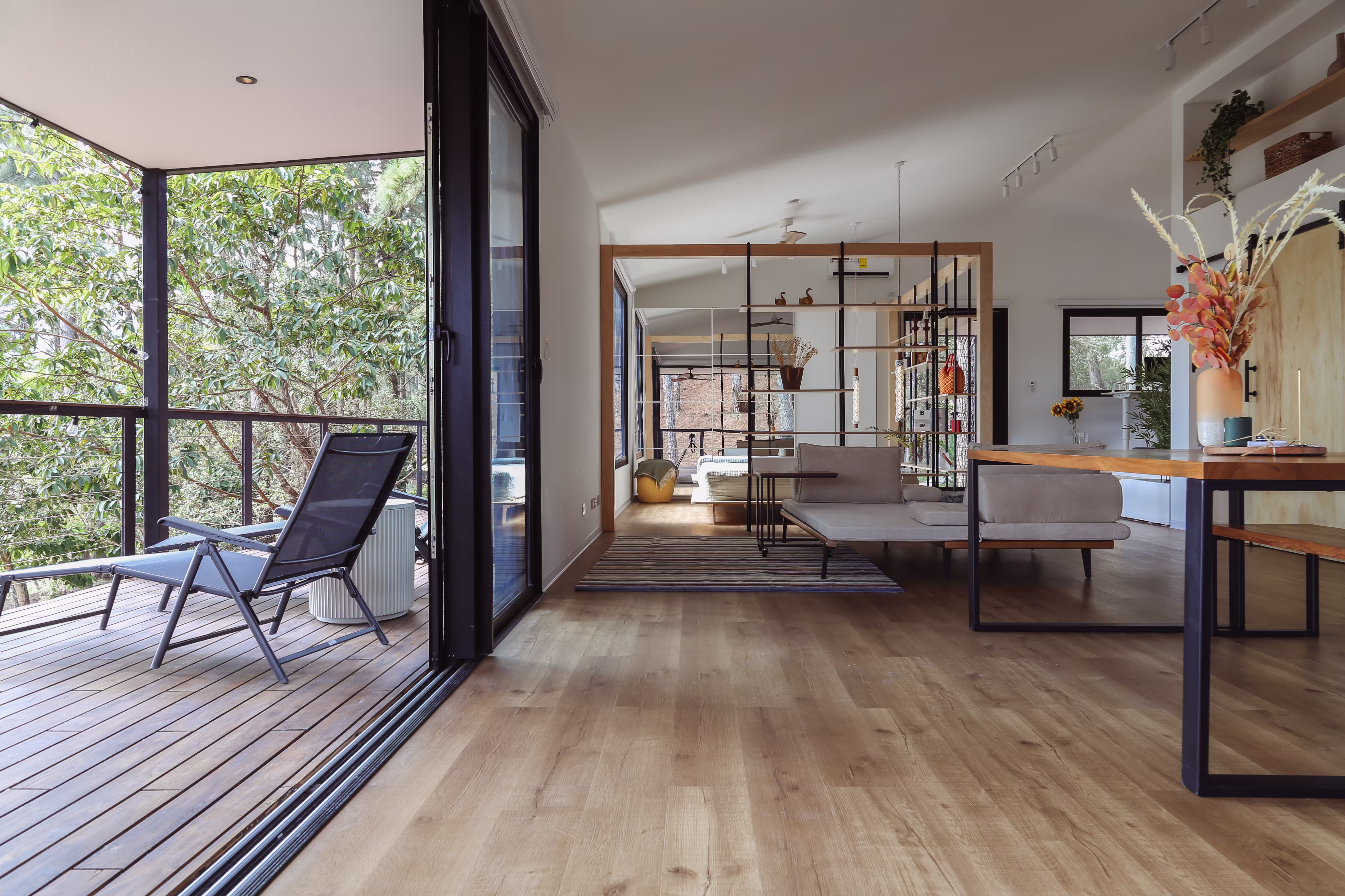 The architectural response is deliberate. Rather than settle into the hillside, the residence lifts—anchored on a platform that fluctuates with the topography, creating a generous void beneath the structure. This gesture gives Casa Bor the sensation of flight, suspending the living spaces between the forest floor and the canopy. The plan is entirely open, dissolving the boundaries between kitchen, living, and work areas, allowing movement and sightlines to flow uninterrupted. Pine-clad facades wrap the volume, grounding the architecture in its context while floor-to-ceiling glazing frames the mountains beyond. In the bedroom, a single large window functions as a living painting—mountain peaks held in perfect composition from the bed.
