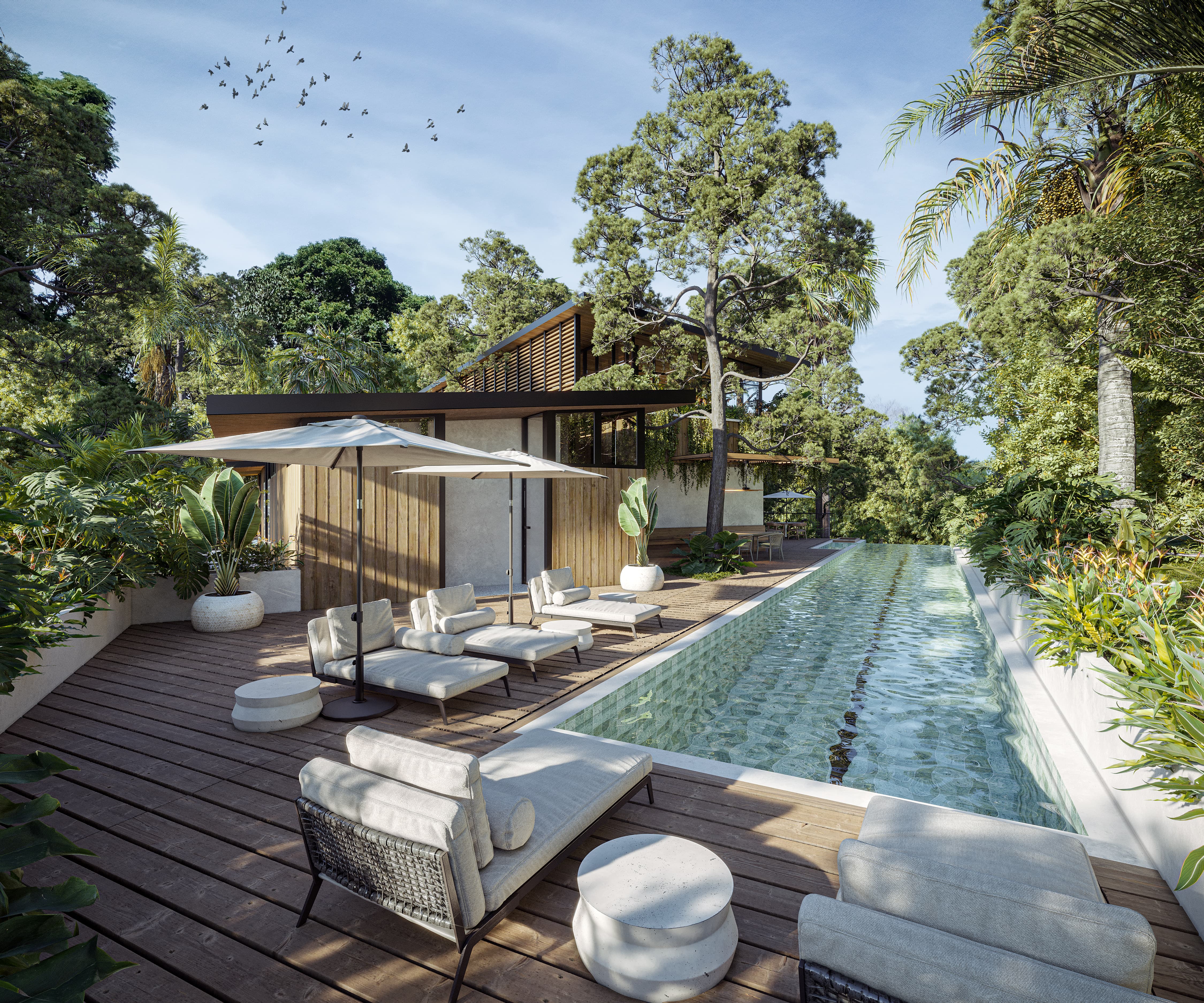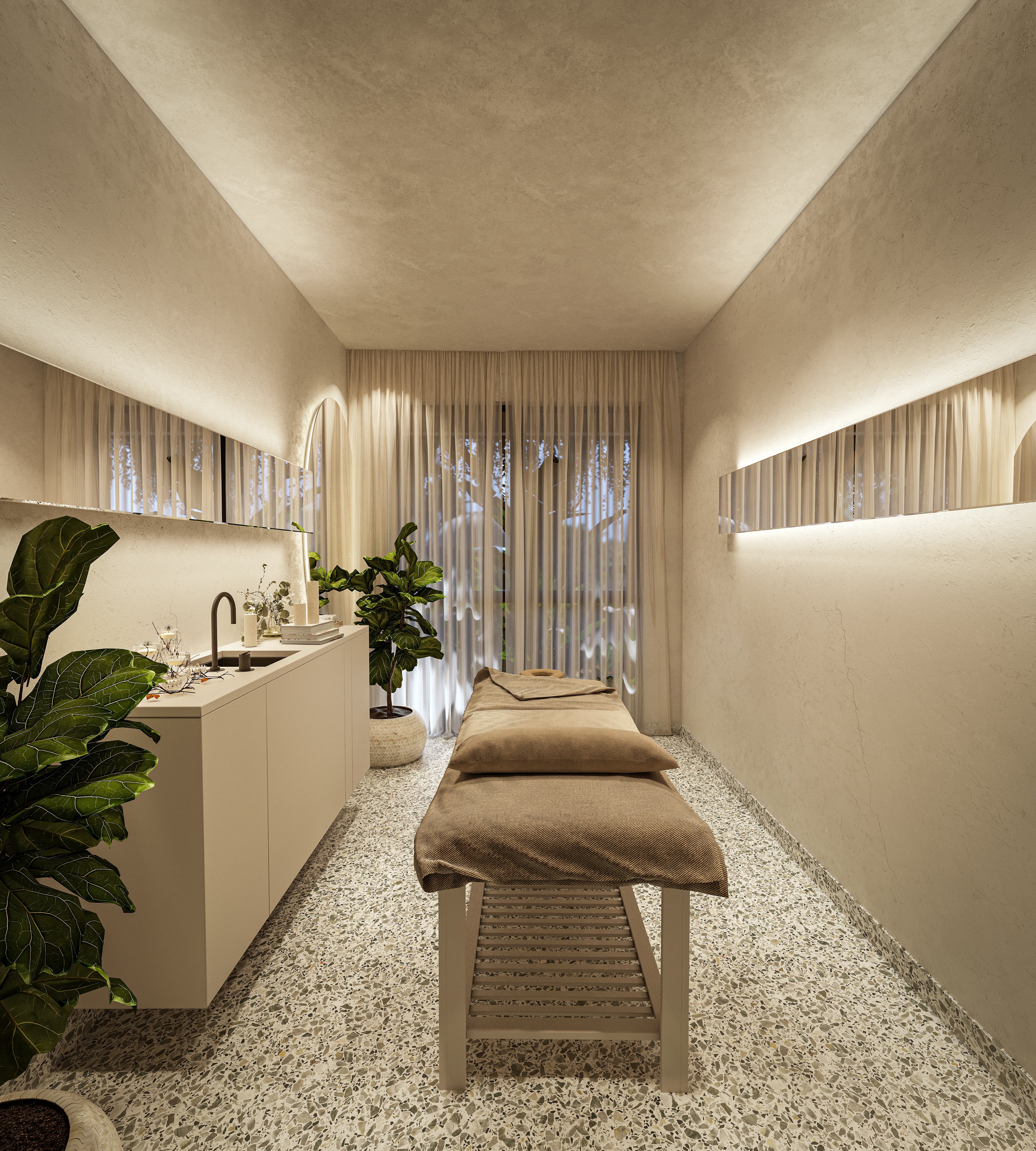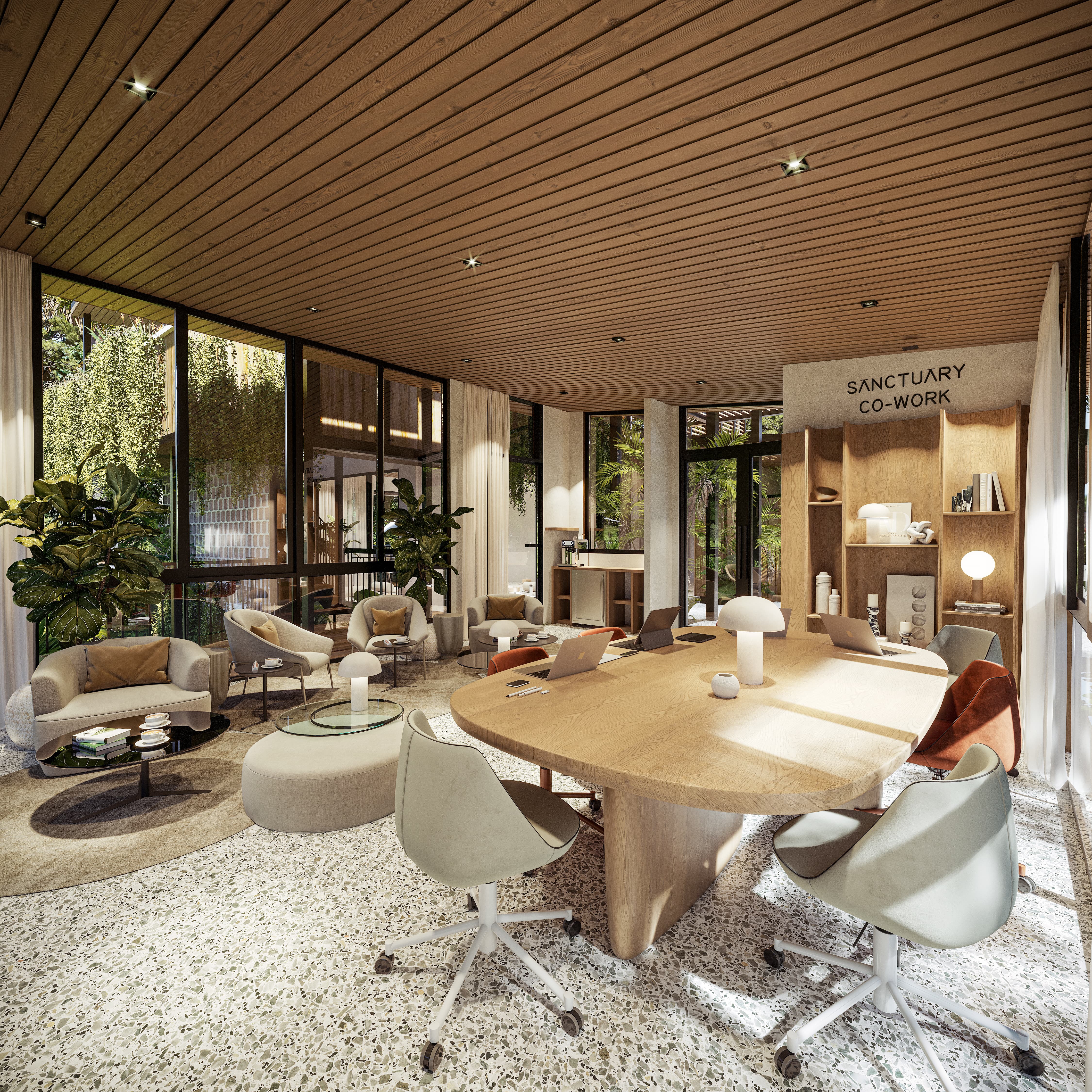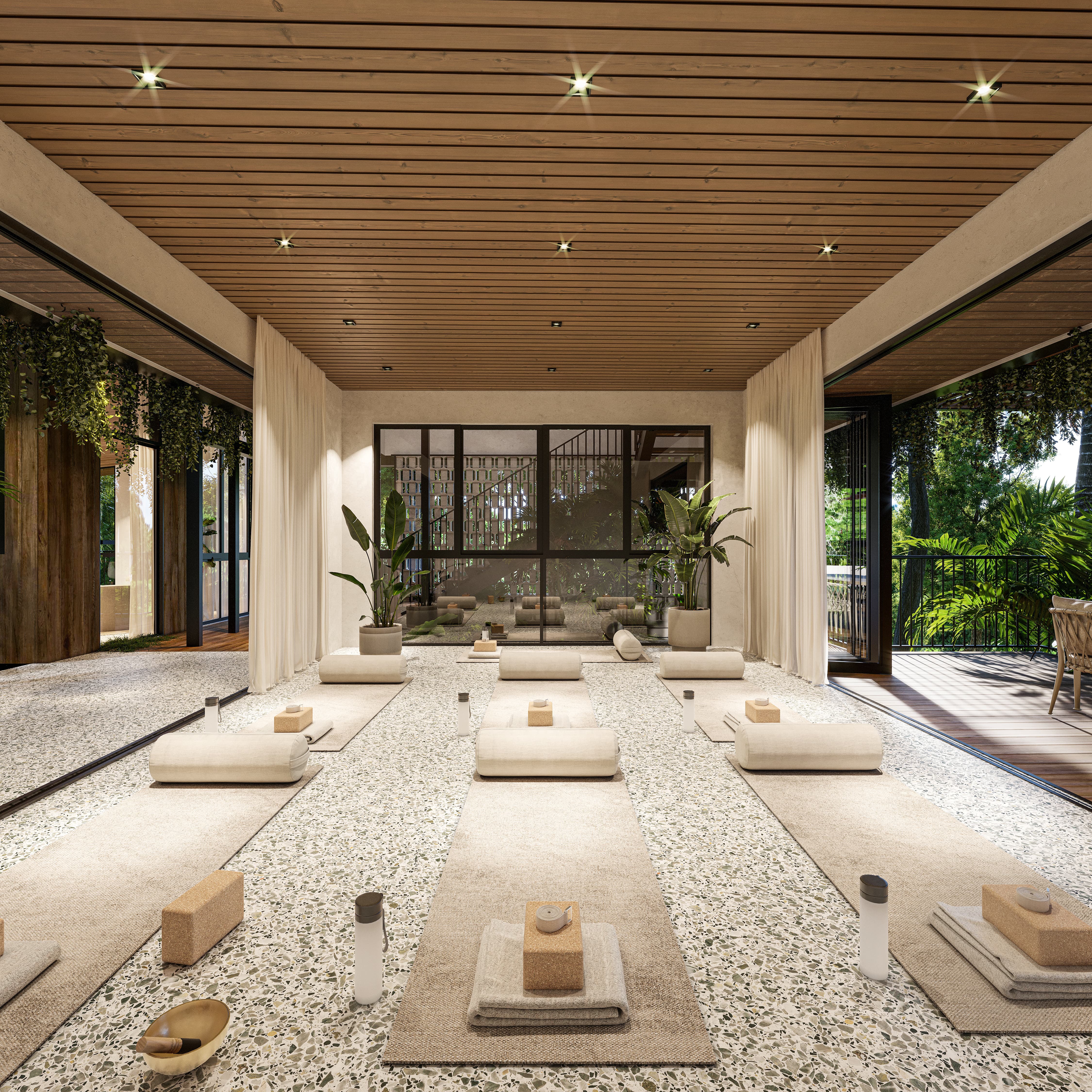 The design emerges from a foundational question: what should a community space offer beyond function? The answer lies in biophilic architecture—understood not as ornament but as structural principle. Every space is shaped to facilitate contact with natural elements, daylight, and vegetation in ways that feel seamless and authentic. The program itself guides the building's identity: a café fosters daily social interaction, a coworking space provides a setting for focused work, a semi-Olympic pool and gym introduce energy and movement, while a yoga studio, sauna, and cold plunge pool create moments of introspection and recovery. Each element is integrated into a cohesive architectural narrative rather than existing as isolated amenities.