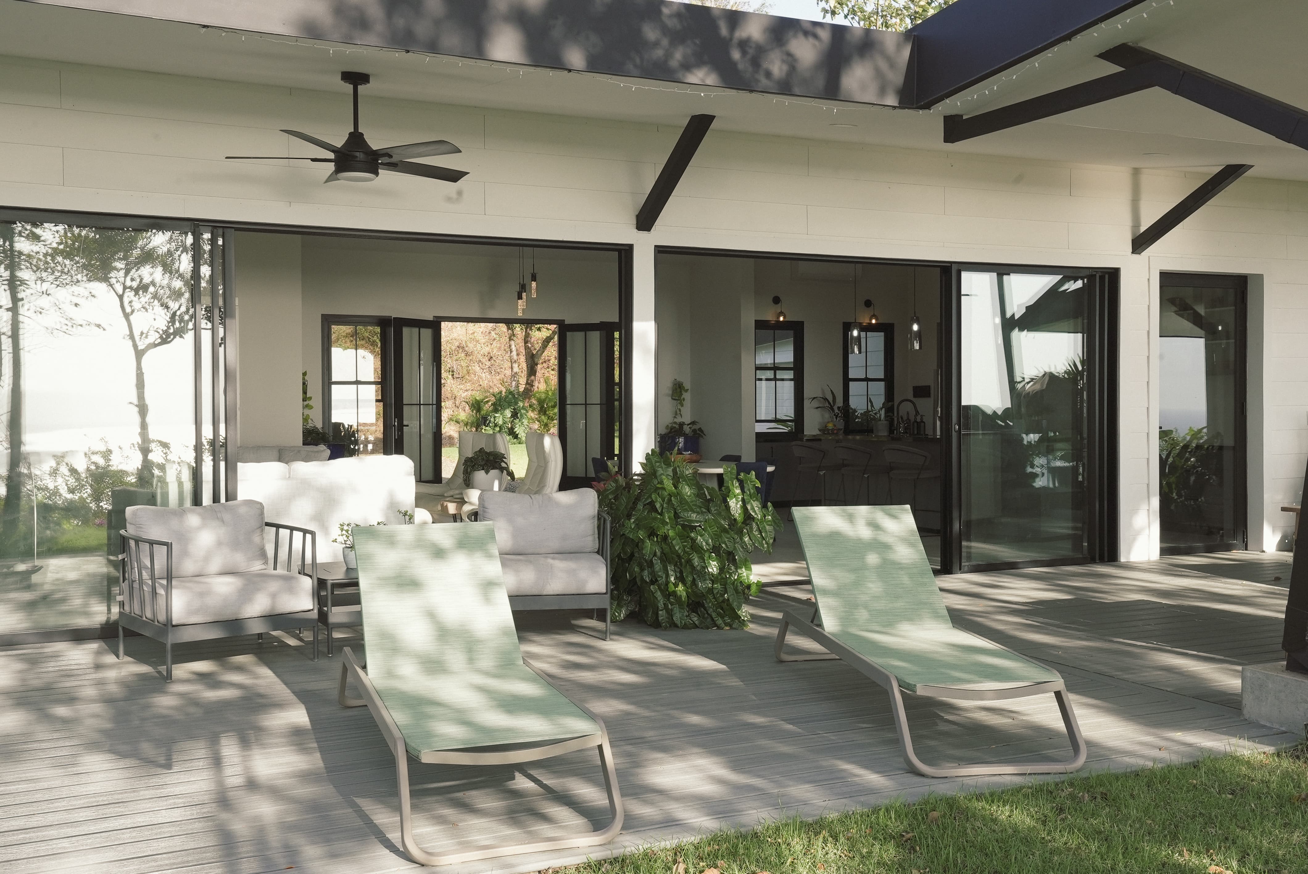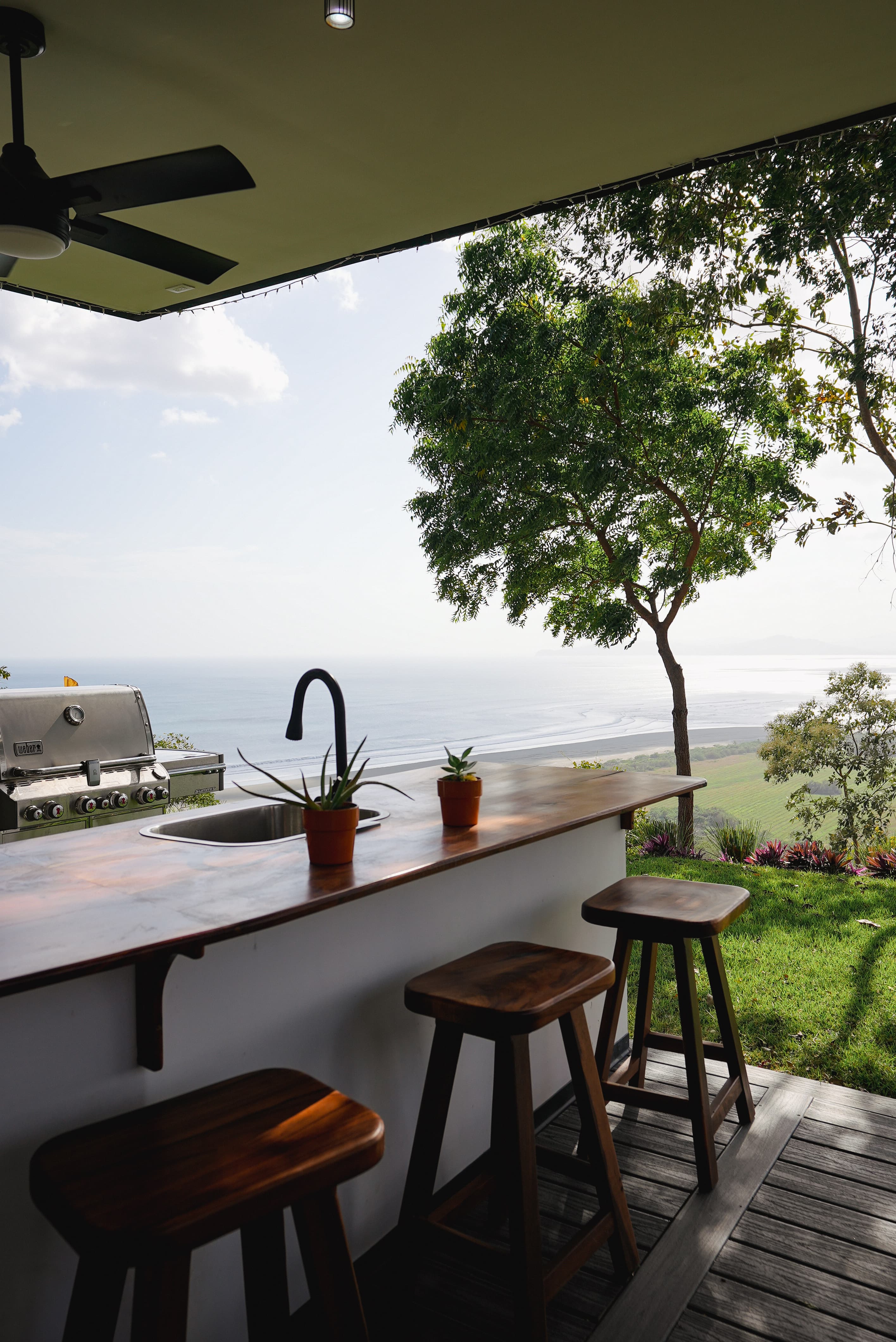 The architectural response centers on generosity of space and openness to climate. The floor plan is entirely open, dissolving boundaries between kitchen, dining, and living areas to create a continuous social zone that extends seamlessly onto an expansive terrace. Here, the outdoor kitchen becomes as essential as the interior one, and the pool functions not as ornament but as the anchor of outdoor life—a place to cool off mid-afternoon, to float at sunset, to gather around after meals. The terrace itself is scaled for true hospitality, large enough to comfortably accommodate thirty guests without crowding, with sightlines that frame both ocean and mountain into the experience of being together.